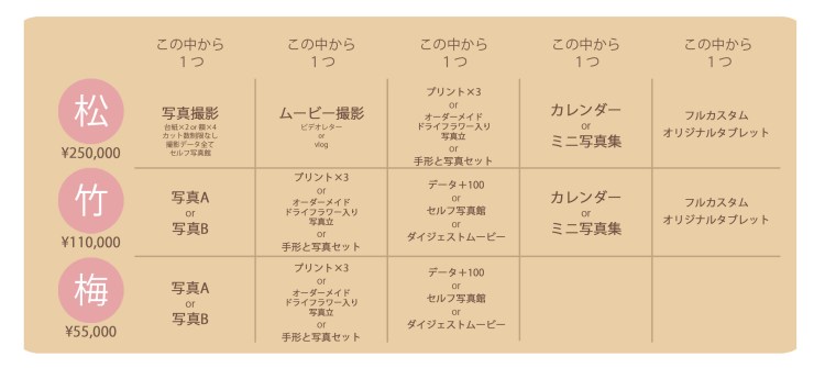 コース 「写真Aや写真Bなどの単品プランだけじゃ物足りない!」「一度にやりたいことがもっとある!」「写真と動画両方撮りたい!」こんな方々にお得な価格設定で、コースを三つご用意しております。 ドライフラワー入り写真立 手形と写真セット カレンダー ミニ写真集 フルカスタムオリジナルタブレット 共有: クリックして X で共有 (新しいウィンドウで開きます) X Facebook で共有するにはクリックしてください (新しいウィンドウで開きます) Facebook いいね 読み込み中…